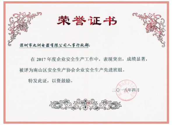 2018年4月20日南山區(qū)安全生產(chǎn)協(xié)會(huì)召開“深圳市南山區(qū)安全生產(chǎn)協(xié)會(huì)會(huì)員大會(huì)”,根據(jù)《關(guān)于評(píng)選2017年度企業(yè)安全生產(chǎn)先進(jìn)班組、優(yōu)秀管理人員的通知》的規(guī)定和要求,經(jīng)專家評(píng)審小組評(píng)定,深圳市九洲電器有限公司人事行政部獲得“2017年度會(huì)員單位安全生產(chǎn)先進(jìn)班組”的榮譽(yù)稱號(hào)。