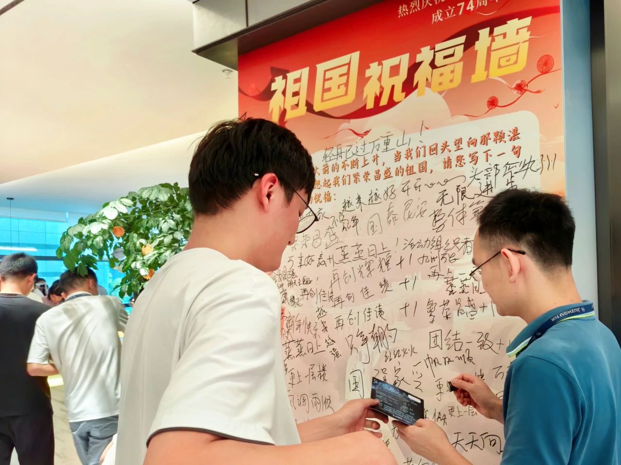 同事們在祖國祝福墻提筆寫下對祖國的美好祝愿或?qū)ι畹拿篮迷妇啊R痪渚鋭尤说淖8UZ,抒發(fā)了大家真摯的愛國之情。